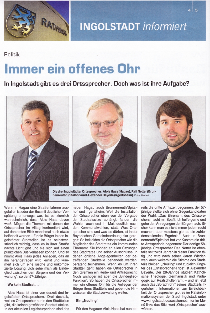 „INGOLSTADT informiert“, das offizielle Info-Magazin der Stadt, berichtet in der Ausgabe vom 25.07.2014 über die Aufgaben der Ortssprecher in Ingolstadt. Den Artikel können Sie hier nachlesen.
