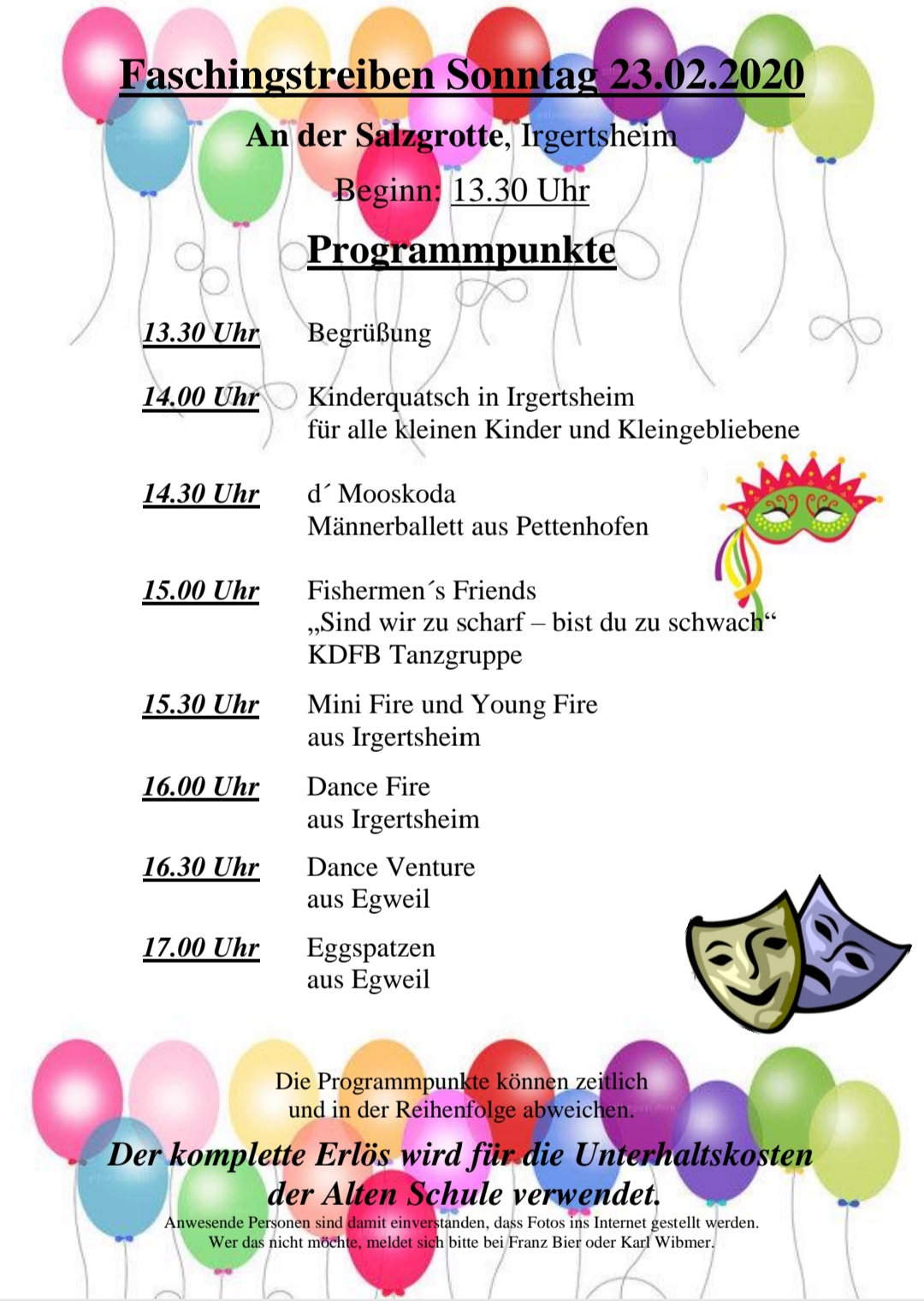 auch in diesem Jahr findet am Faschingssonntag das traditionelle Faschingstreiben statt. Bitte beachten Sie den diesjährigen Veranstaltungsort: Der närrische Spaß findet vor der Salzgrotte an der Dreiländerstraße statt.