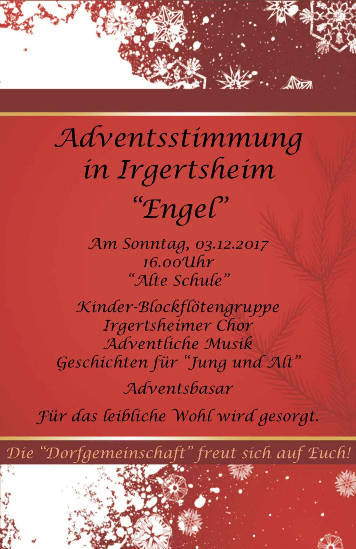 Heuer gibt es in der Irgertsheimer Vorweihnachtszeit eine echte Premiere – nämlich eine von engagierten Bürgerinnen und Bürgern veranstaltete Adventsfeier. Die „Irgertsheimer Adventsstimmung“ in der Alten Schule steht unter dem Motto „Engel“.