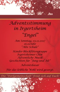 Die Veranstaltung „Irgertsheimer Adventsstimmung“ war auch heuer wieder ein großer Erfolg. Die zahlreichen Besucherinnen und Besucher erfreuten sich am besinnungsollen Programm ebenso wie an den Ständen des Adventsbasars, wo es viele handgemachte Weihnachtsartikel zu bewundern und zu erwerben gab.