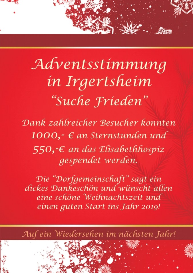 ich wünsche Ihnen allen zum Start in den Advent eine gesegnete, friedliche und möglichst stressfreie Weihnachtszeit! Passend hierzu gibt es einen Nachbericht zur heutigen „Irgertsheimer Adventsstimmung“ auf der Internetseite unserer Pfarrei. Den entsprechenden Link finden Sie hier.