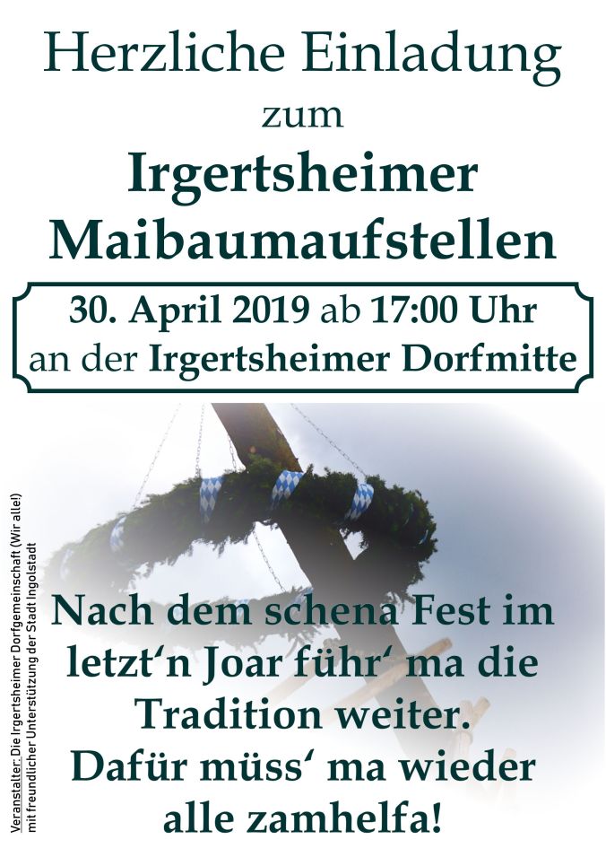 Der diesjährige Irgertsheimer Maibaum steht. Im Rahmen eines schönen Fests, das bei traumhaftem Wetter an der Dorfmitte stattfand, konnten zahlreiche Besucherinnen und Besucher dem traditionellen Aufstellen des Baums beiwohnen. An dieser Stelle bedanke ich mich – auch in Namen der Stadt Ingolstadt – bei allen Helferinnen und Helfern sowie Gästen, die dazu beigetragen haben, dass dieses Brauchtum in unserem Stadtteil fortbesteht.